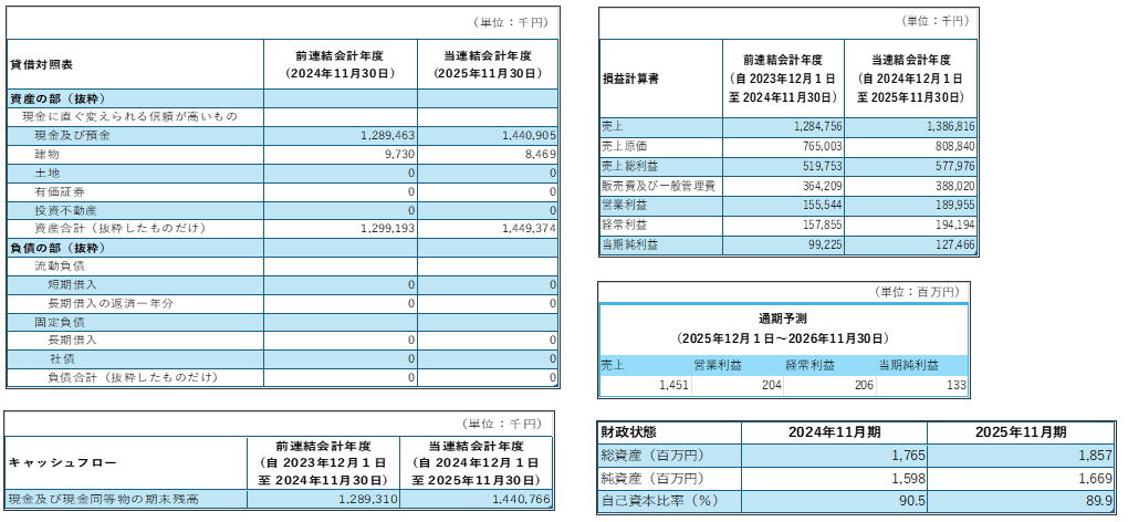 株式会社エクスモーションは決算期が11月、2025年11月期決算短信の貸借対照表、損益計算書、通期予測、キャッシュフローより必要な部分のみ抜粋している。