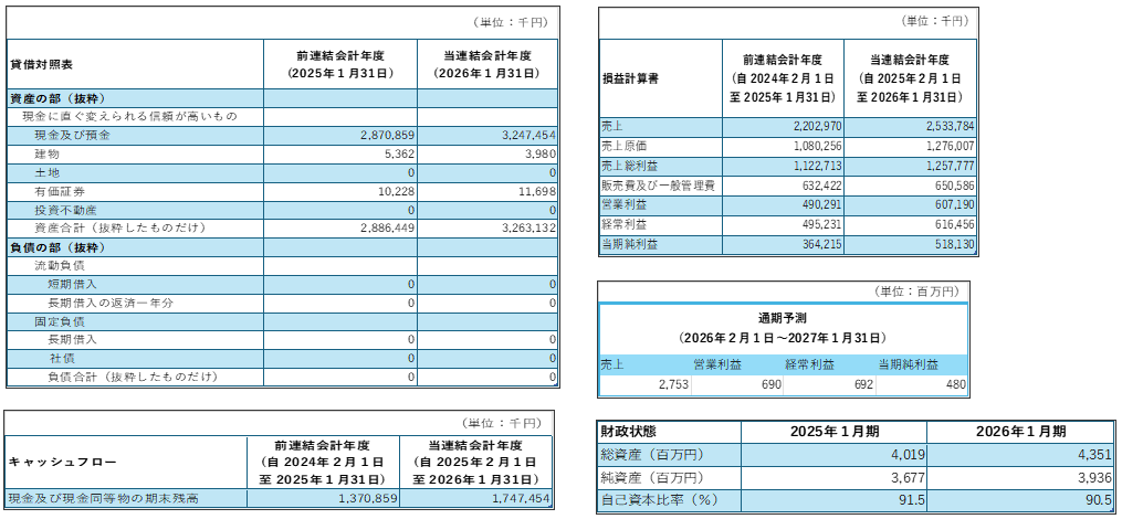 株式会社ジャストプランニングは決算期が1月、2026年1月期決算短信の貸借対照表、損益計算書、通期予測、キャッシュフローより必要な部分のみ抜粋している。